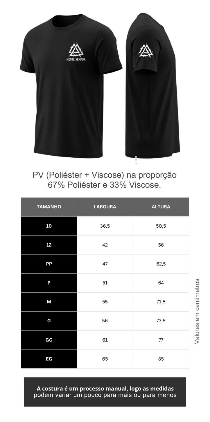 Produzida em tecido PV 67/33 (67% Poliéster + 33% Viscose), ela entrega toque leve e macio, excelente caimento, alta durabilidade, secagem rápida e conforto térmico superior. Uma malha que não desbota com facilidade, não amassa e foi feita justamente para acompanhar a rotina de quem vive no ritmo da disciplina.